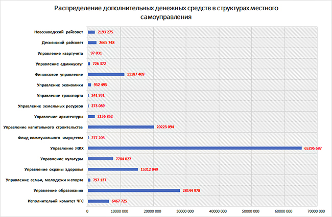 Членам исполкома раздали список дополнительного финансирования управлений и отделов Черниговского городского совета. Таким образом была распределена сумма более чем 164 млн грн. Если визуализировать распределенные деньги по структурным подразделениям горсовета, то мы получаем следующую картинку: