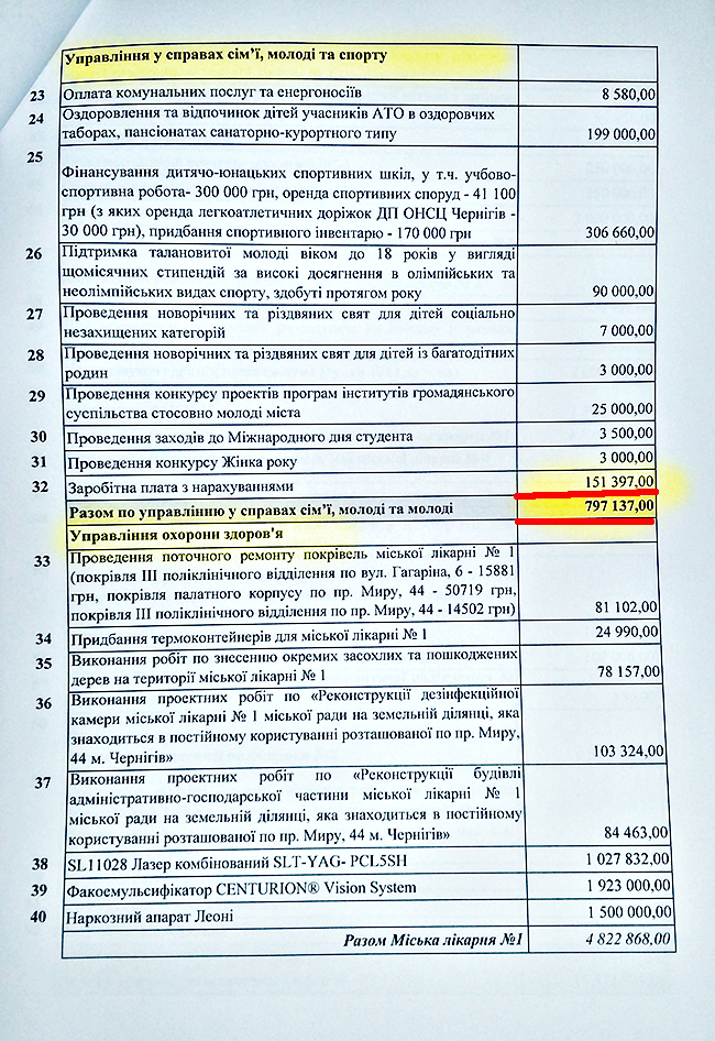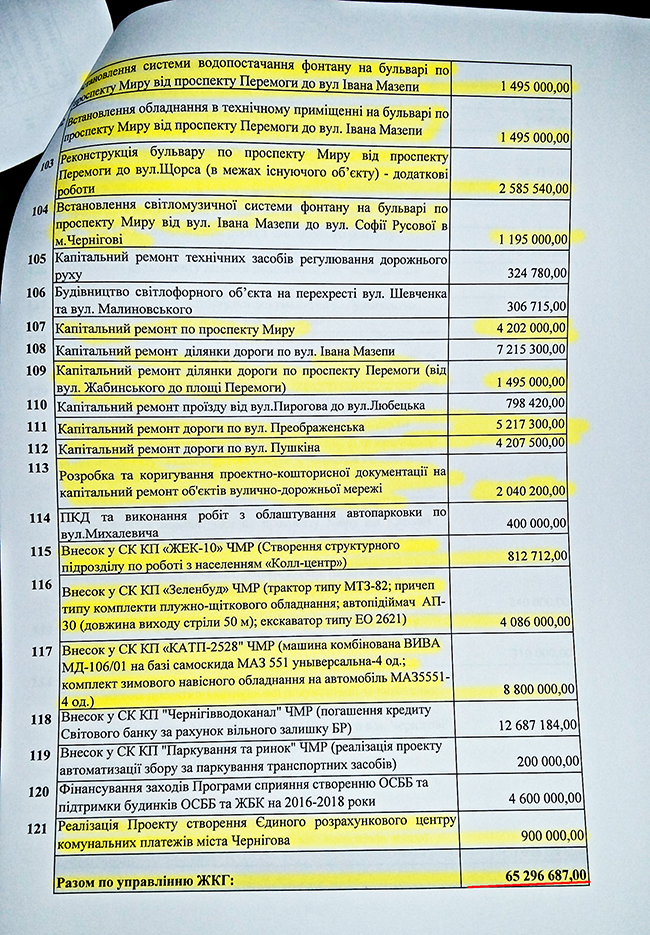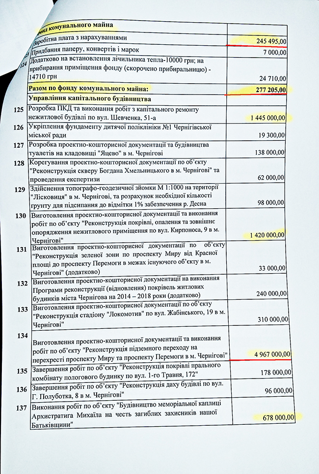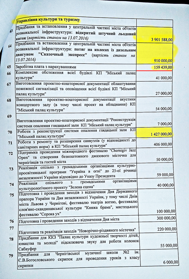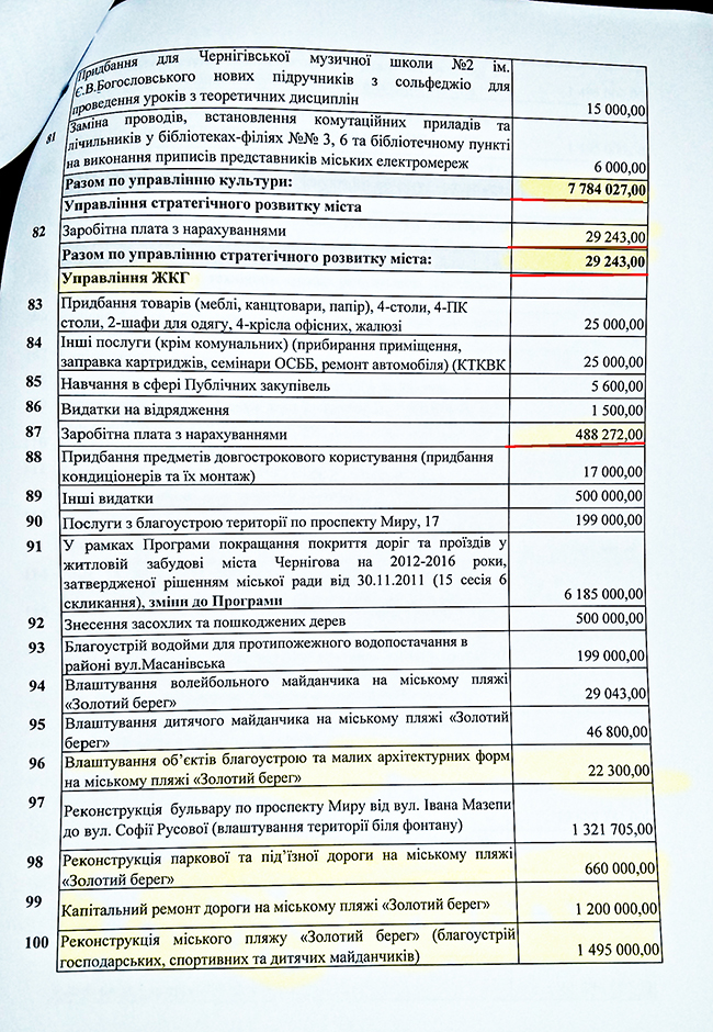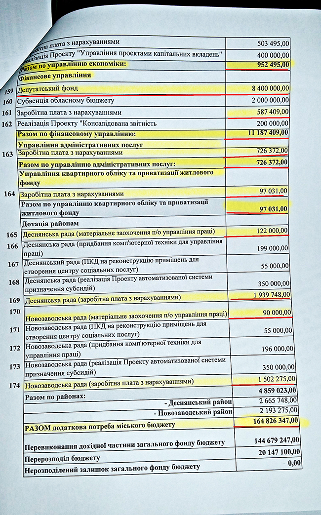 В плане распределения 164 млн грн, на финансовое управление ЧГС было выделено более 11 млн грн, из которых 8,4 млн грн планируется направить на «Программу осуществления мероприятий, которые не могли быть предусмотрены при составлении городского бюджета, и обеспечение деятельности депутатов Черниговского городского совета на 2016 год». Такие затраты в народе называют «депутатским фондом».