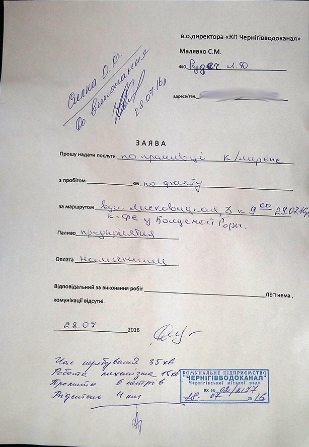 Как выяснилось, звонивший, в прошлом – сотрудник КП «Чернигововдоканал». Он занимал там руководящую должность среднего звена и был в курсе ситуации на предприятии. Поэтому у него была прямая заинтересованность показать, что ситуация на предприятии не изменилась. Но, как видим, «халтурка» работников КП «Черниговводоканал» была зафиксирована довольно качественно и не доверять увиденному у нас не было никаких оснований.