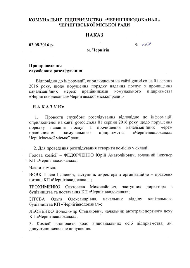 Как видим, наведение порядка на предприятии продолжается. Будем надеяться, что контроль со стороны жителей Чернигова поможет новоназначенному директору КП «Черниговводоканал» навести порядок не за годы, а за несколько ближайших месяцев.