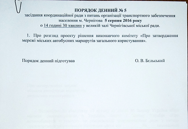На повестку дня координационного совета по вопросам транспортного обеспечения населения города Чернигова выносился один вопрос: «Об утверждении сети городских автобусных маршрутов общего пользования». В начале заседания выступил начальник управления Александр Бельский, который объяснил суть вынесенного на координационный совет предложения.