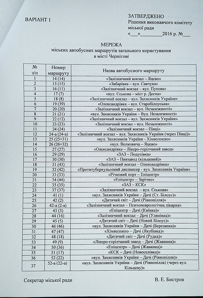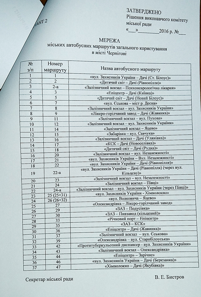 Поменять все номера автобусных маршрутов, – с таким предложением выступил начальник управления транспорта и связи Александр Бельский. Его предложение на рассмотрение координационного совета по вопросам транспортного обеспечения населения города Чернигова вынес голова совета Александр Кириченко. За не совсем понятным для большинства членов совета предложением стояло уже подготовленное решение исполкома горсовета о разрыве договоров со всеми перевозчиками одновременно. Присутствующие оценили это, как передел транспортной сети Чернигова.