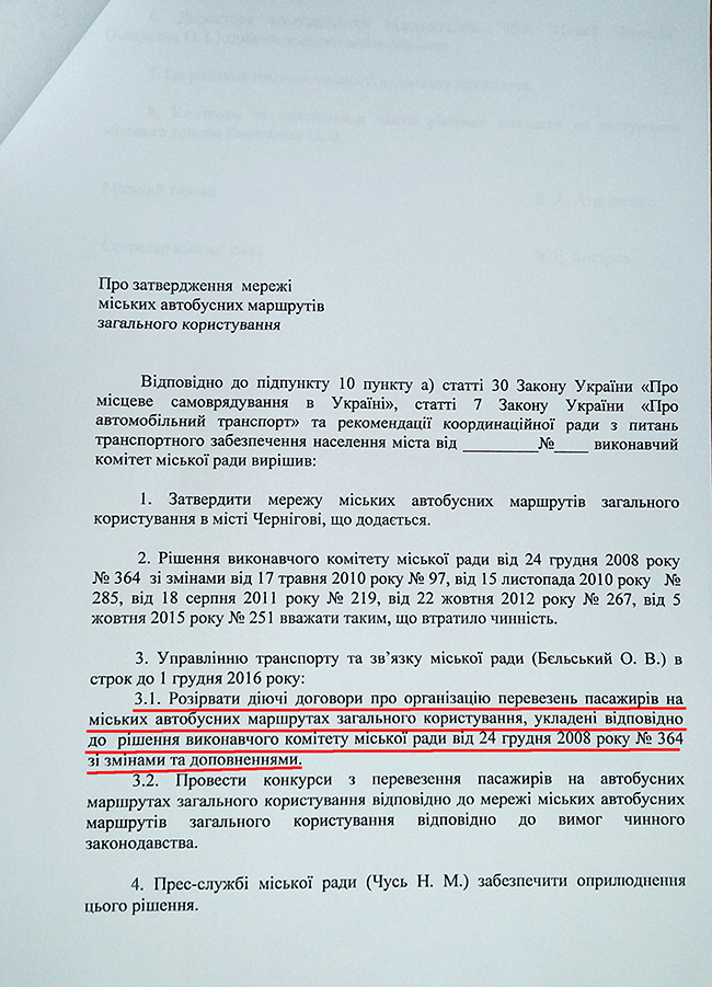 Следует отметить, что городская власть, за последние полгода внесла дестабилизирующую нервозность в вопрос перевозок. Ни один перевозчик не уверен в завтрашнем дне, а поэтому не видит смысла и опасается вкладывать деньги в покупку новой техники. Инвестиции придут только туда, где есть порядок, четко определенные правила, которых придерживаются все стороны. В то же время, даже за ширмой, не первый взгляд, не совсем понятного решения о смене нумерации маршруту, стояла другая, гораздо более серьёзная проблема: одновременный разрыв договоров со всеми перевозчиками и объявление нового конкурса на маршруты. Соответствующее решение исполкома Черниговского горсовета уже было подготовлено управлением транспорта и связи.