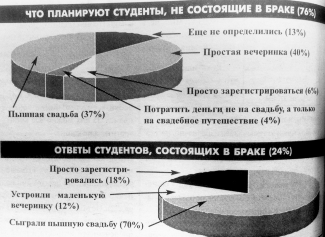 Ответ на этот вопрос мы решили поручить, проведя опрос среди студентов 4-5 курсов Черниговского педагогического университета. Результаты опроса показывают, что большинство опрошенных студнтов (76%) не состоят в браке. Из них 40 % видят свою свадьбу в виде простой вечеринки, 37 % мечтают сыграть пышную свадьбу, 6 % - согласны просто зарегистрировать брак, 4 % хотят потратить деньги не на свадьбу, а на путешествие, остальные же 13% - ещё не определились.