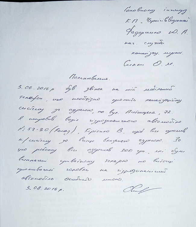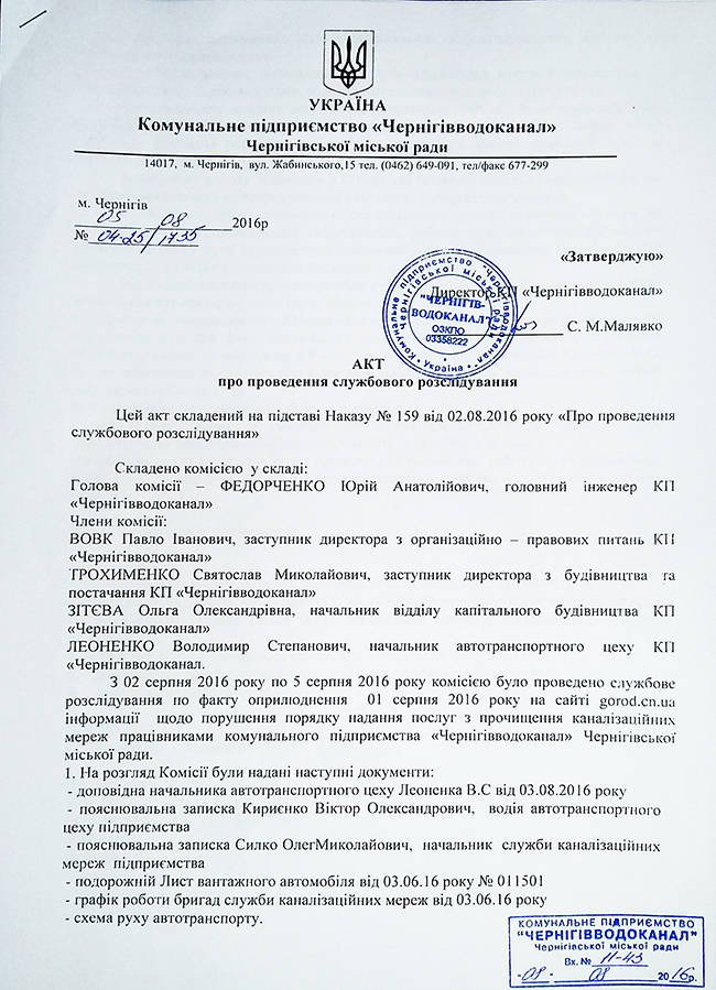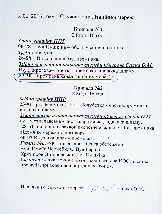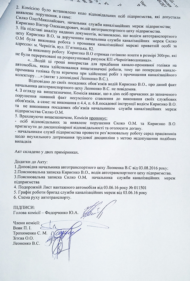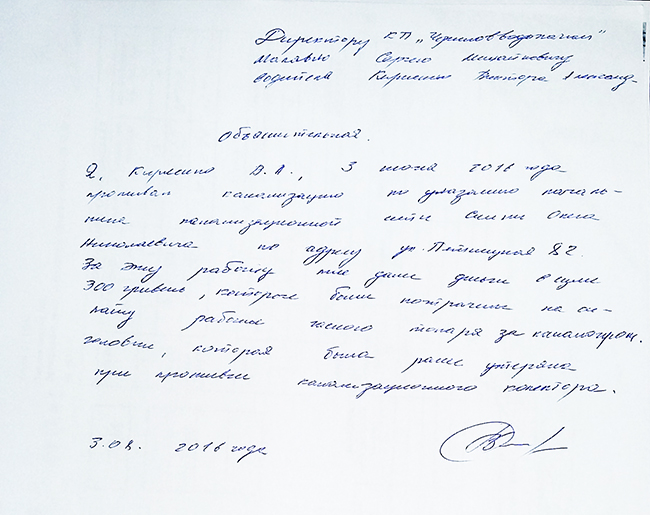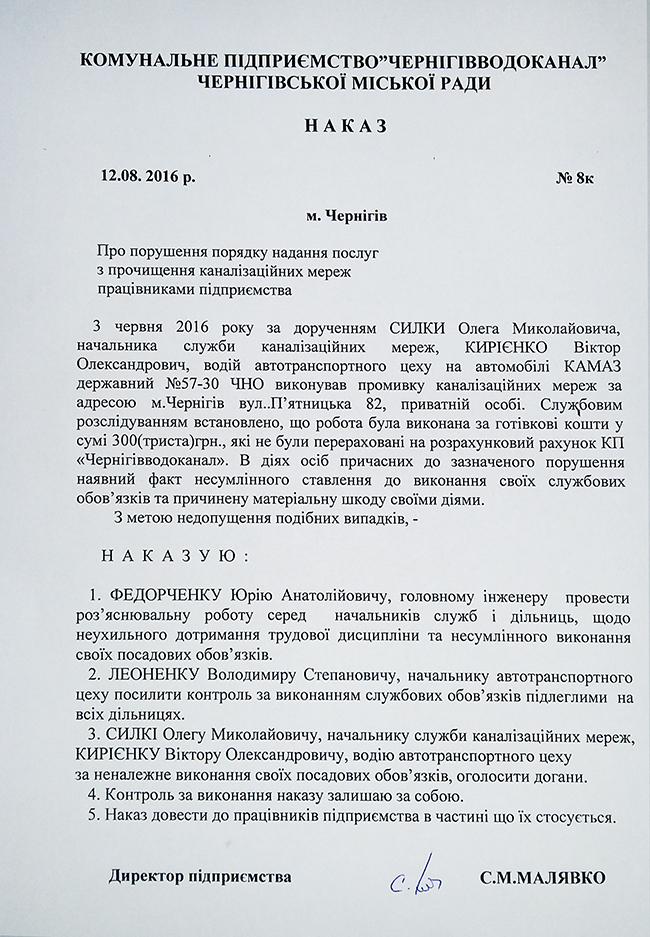 – Служебное расследование мы провели довольно быстро. Были моменты в объяснительных записках – сотрудники просто покрывают друг друга. Проверка показала, что действительно, руководитель службы канализационных сетей дал адрес подчинённому водителю. Водитель поехал, выполнил работы, взял наличные деньги и передал их непосредственному начальнику – руководителю службы канализационных сетей. Естественно, в объяснительных они пишут, что все было сделано с благими намерениями – полученными деньгами они оплатили работы токаря – изготовление промывочной головки для автомобиля, на котором проводились работы. Эта промывочная головка, якобы, была утеряна еще в начале года во время проведения работ. Думаю, что это не соответствует действительности, – сообщил нам о результатах служебной проверки директор КП «Черниговводоканал» Сергей Малявко.