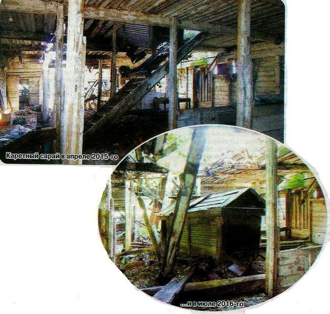Еще в худшем состоянии каретный сарай. В прошлом году здесь еще частично была крыша, сохранилась даже лестница, которая вела в небольшую кровельную надстройку. В этом году и лестница, и надстройка упали внутрь. Еще одна зима — и от каретного сарая останутся разве что стены. А между тем именно это сооружение считается одним из самых старых деревянных строений Левобережья. Когда-то рядом с ним был еще и амбар - поднятая на стояках двухсрубная клетка. Сейчас ее уже нет. Как и одноэтажного деревянного флигеля, который стоял еще до начала 1980-х годов с западной стороны бывшей подъездной аллеи.
