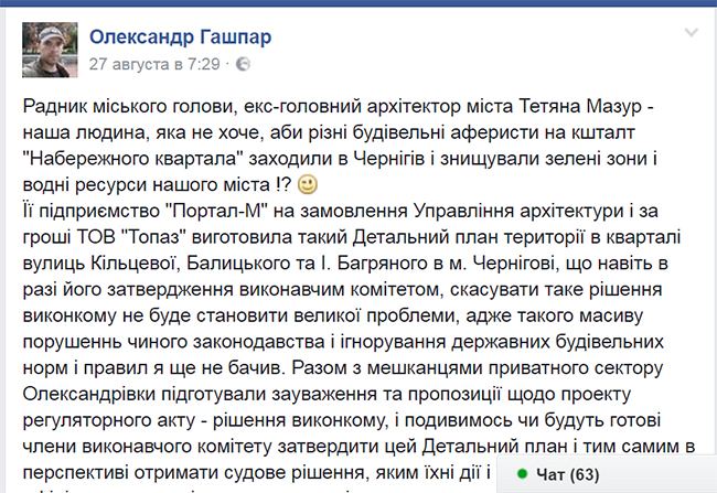 Земельные и строительные вопросы в Чернигове не обходятся без скандалов. Не обошлось без обострения ситуации и вокруг вопроса разработки Детального плана территории в квартале улиц Кольцевой, Левицкого и Багряного в Чернигове. Проект был выполнен ООО «Портал-М», которым руководит внештатный советник городского головы Татьяна Мазур. Представленный Детальный план территории подвергся критике со стороны жителей Александровки, которые были обеспокоены предстоящим строительством и общественного активиста Александра Гашпара. Чем закончится диалог между городской властью, архитектором и активистами – пока предположить сложно, но уже сейчас можно сказать, что специалисты, с мнением которыми считается городской голова, поддерживают строительство.