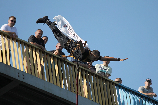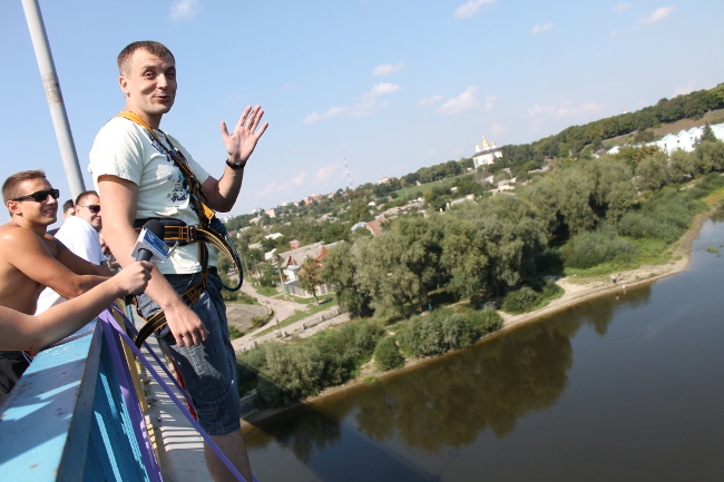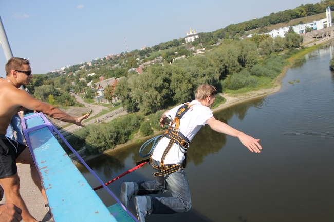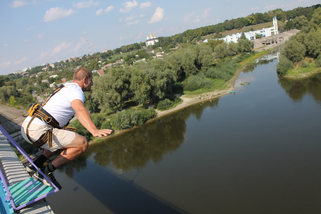 С громкими криками участники боевых действий на востоке Украины шли не в атаку, а прыгали с пешеходного моста в Чернигове, повышая в своей крови адреналин.
