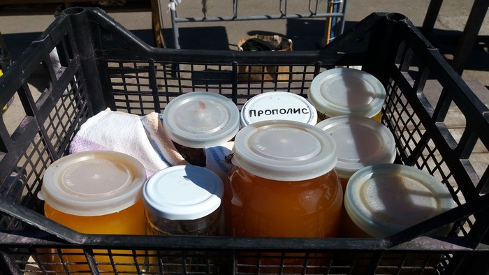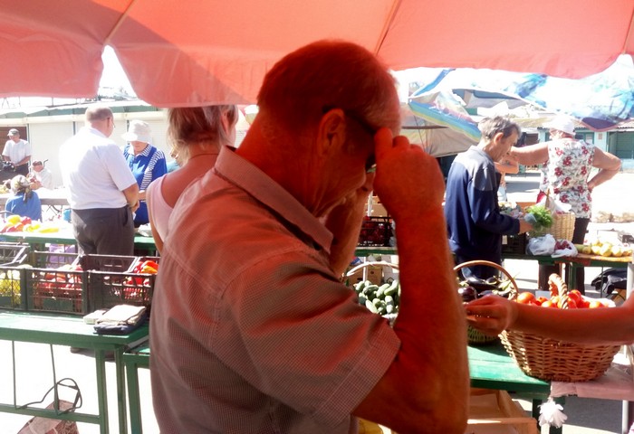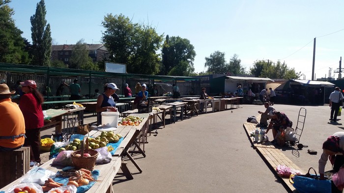 - Начинаю торговать перед христианским праздником Спас яблоками, грушами, медом. Сейчас здесь торговля идет плохо. За день я продал всего 4 полулитровых баночки меда по 40 грн., в то время, как на других рынках баночку 0,5 л продают от 60 до 90 грн. в зависимости от вида меда. В прошлом году у меня был 21 бидон мёда, по 40 л в каждом, я продал весь мёд до 10 декабря. В этом году буду продавать, наверное, до следующего Спаса. Сюда на рынок заходит гораздо меньше людей, чем было за территорией рынка, за забором. Люди проходили и, хочешь-не хочешь, а покупали всё, что им нужно было. Что касается условий торговли, то тут люди в обморок падают. Бабушки старенькие, приезжают из сел, чтобы заработать копейку к пенсии, еле выдерживают на жаре 30 градусов.