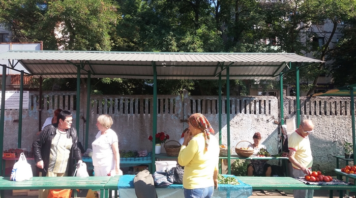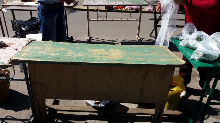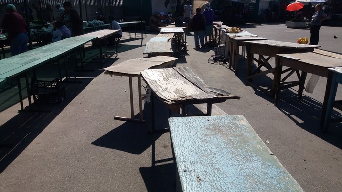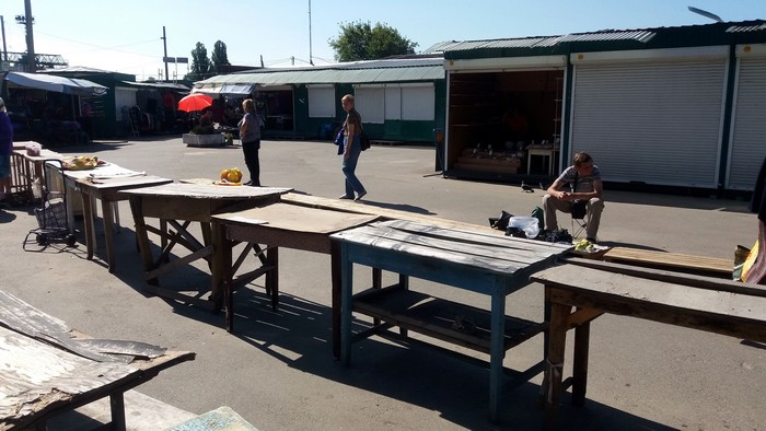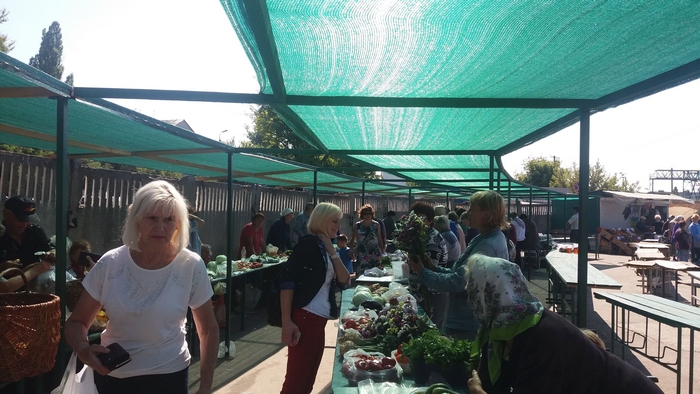 - Чтобы занять хорошее место, приходится приезжать в 4-5 часов утра. Рынок совсем не оборудован для продавцов. Вот только напротив, возле забора есть места с металлической крышей. Пока тепло, еще можно торговать, прячусь от солнца под зонтом (установил личный пляжный зонт), а когда начнутся холода, мы не защищены ни от дождя, ни от снега. Только зелёные столы, как вы видите, новые и предназначены для торговли, а остальные – это насмешка над людьми. На улице под заборчиком было лучше. 3 гривны – не деньги, но там мы стояли в тени, быстро распродавали товар и уезжали. Там больше поток покупателей. Со временем, конечно, люди привыкнут и сюда будут ходить за домашней продукцией, но для этого нужно оборудовать рынок, может построить павильон.