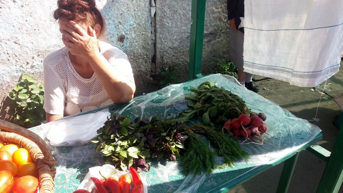 Наталия Федоровна, 57 лет, на пенсии, привезла из села Бакланово Нежинского района зелень (базилик, укроп), редис, красный острый перец. Прячется от солнца, повесив рядом полотенце.
