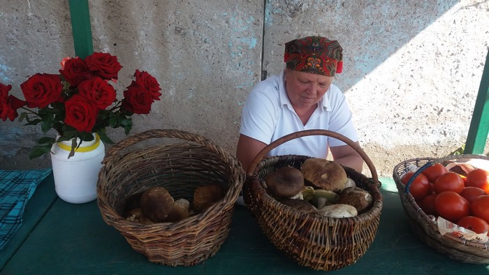 Галина Петровна привезла на продажу белые грибочки по 80 и 50 грн. за кг, выращенные в своем огороде, красные и желтые сорта помидоров.