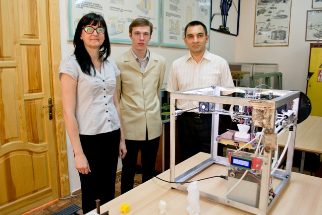 Александр Кривокурцев с заведующей кафедрой Ириной Прибитько и научным руководителем Тимуром Ганеевым возле созданного 3D-принтера