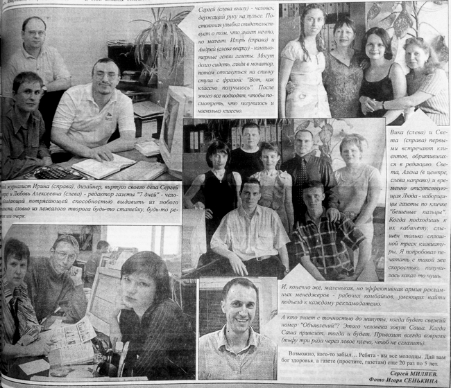 В этой команде отношения не только, вернее, не столько деловые, сколько дружеские, исключительно человеческие. Хотите верьте, хотите нет, но за пять лет не было ни одной служебной интриги (согласитесь, большая редкость). Возможно, это настроение искренностн и доверия каким-то образом передалось и читателям. И, отчасти, этим можно объяснить быстро пришедшую к газете "Объявления” популярность.