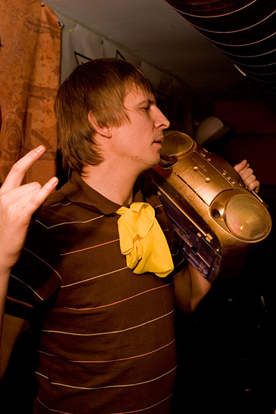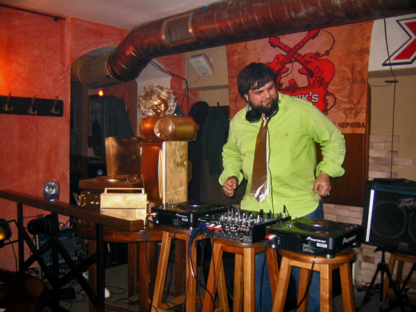 Музыкальной частью вечеринки рулили три персонажа – резиденты «No Commerce», выведенные в афише под никами Mysterious и BoochyaMan Selecta, центральное место в лайн-апе занял фронт-мен черниговского медиа-проекта «Фоа Хока» - человек, музыкант, диджей и художник Дмитрий Куровский, по совместительству – автор инсталляции, украсившей сцену этим вечером и подаренной заведению по его завершении.