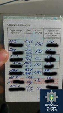 Прокомментировали полицейские и случай с нарушителем-рекордсменом, на которого только в 2016-м году было составлено 7 протоколов по статье 130-й (позже выяснилось, что их 10, просто в талоне не хватило места за 13.02, 11.03, 29.03, 04.04, 16.04, 17.04, 24.04). 50-летний мужчина ездил на машине марки Форд, оформленном на некую женщину. Каждый раз в суде, ему присуждали оплатить штраф, но злостный нарушитель-алкоголик продолжал рассекать по Чернигову на авто с просроченным временным таланом, что был выдан в апреле, вместо водительских прав. По большинству протоколов еще нет решений суда. Дополнительной информации у патрульных по этому случаю нет, так как большая часть протоколов была составлена еще до появления новой полиции.