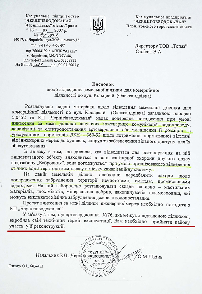 2. ООО «Топаз», арендующее земельный участок у города и архитектурная мастерская «Портал-М» по-своему трактовали письмо КП «Черниговводоканал», в котором говорилось о том, что артезианская скважина №76 водозабора «Бобровица» выработала свой ресурс. Прочитав первое предложение письма, подписанного А. Шкинем в 2007 году, они не прочитали второго предложения. А в нем, как раз, шла речь о реконструкции скважины, а не о ее закрытии.