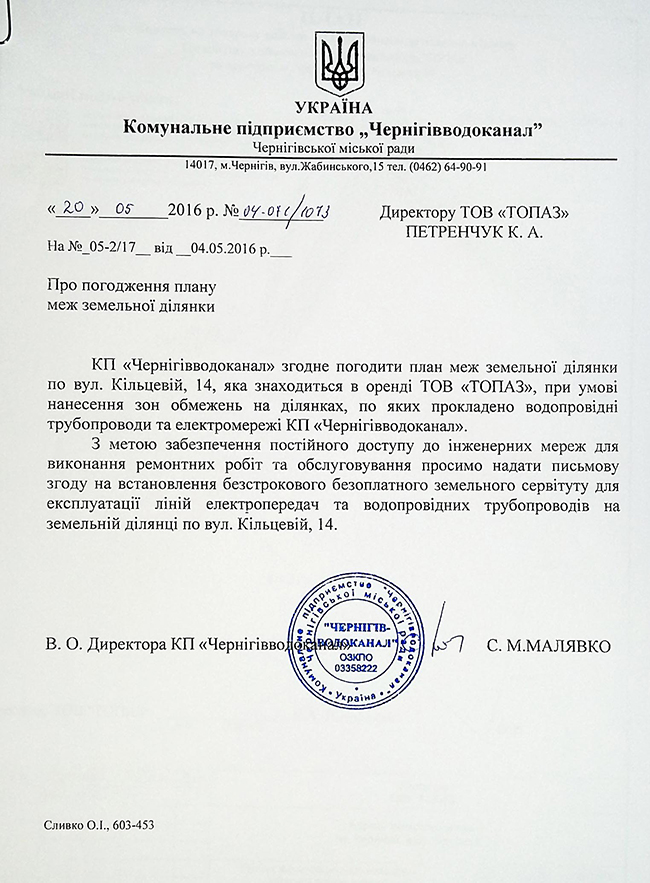 На фото: письмо КП «Черниговводоканал» фирме «Топаз» по согласованию проекта