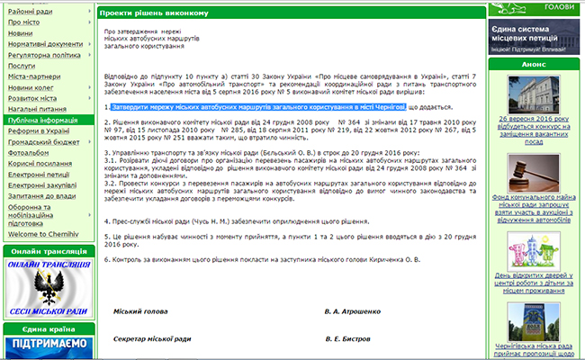 Утверждение сети городских автобусных маршрутов общего пользования в городе Чернигове было вынесено на заседание исполкома городского совета 15 сентября. Неожиданно для присутствующих, городской голова Владислав Атрошенко заявил, что рассмотрение этого проблемного для Чернигова вопроса переносится на неделю, до согласования с Черниговской ОГА. В то же время эксперты уверены, что транспортная сеть города требует дополнительных согласований и уточнений. Непрофессиональное вмешательство в работу городского транспорта может привести к возникновению серьёзных проблем, вплоть до остановки отдельных маршрутов.