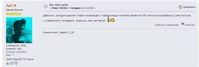 Уже на следующий день мусор опять «всплыл». На форуме rebenok.cn.ua черниговчанкой Ириной (фамилию девушка не пожелала назвать), была опубликована следующая информация «…сегодня ранним утром на выезде с города наши мужики заметили 50-тонные мусоровозы (уже пустые) с львовскими номерами…».