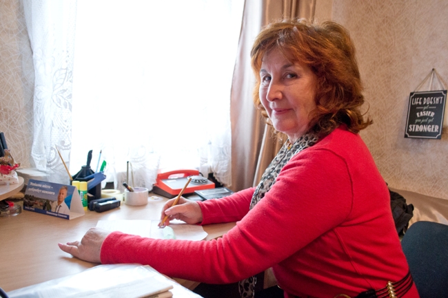 Встречаемся с Людмилой Жерносек в 11 часов утра, она выходит на порог дома. В это время у пенсионеров как раз должно начинаться занятие английского языка. Мы поднимаемся в квартиру. В большой комнате мебели немного — стол и стулья, здесь и проходят практически все занятия в кружках и здесь же будет проходить урок (если так его можно назвать) английского языка. Другая комната практически полностью заставлена — стулья, кресла, стол с компьютером, книжный шкаф на всю стену, заполненный книгами и множество картин, картинок, статуэток и многого другого.