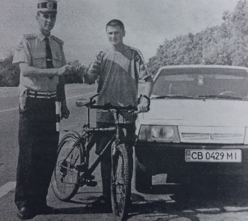 Инспектор ДПС Чернигова, прапорщик милиции Анатолий Малашта вручает велосипедисту светоотражающие катафоты