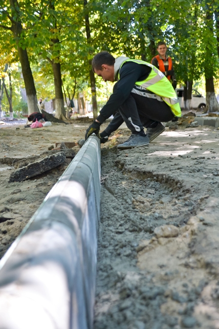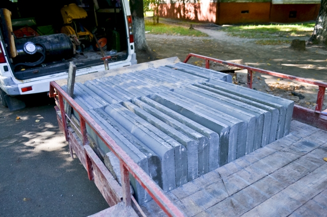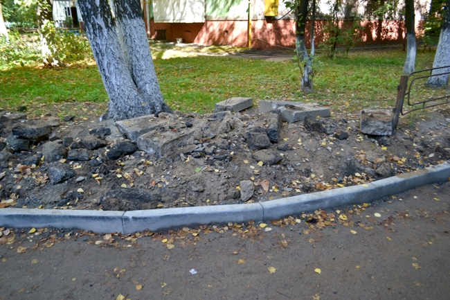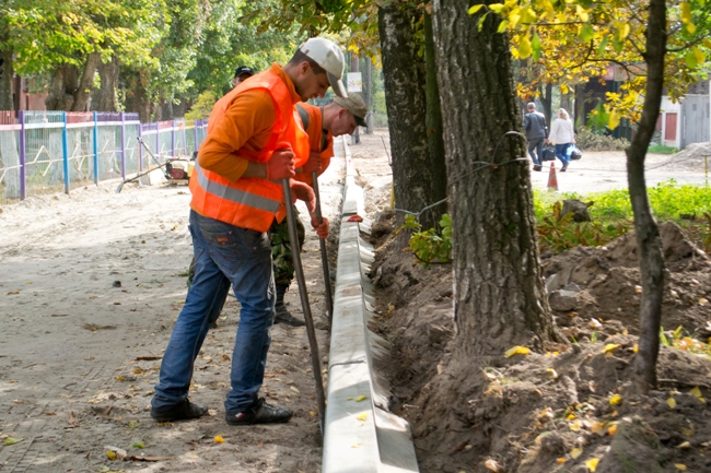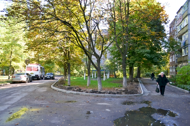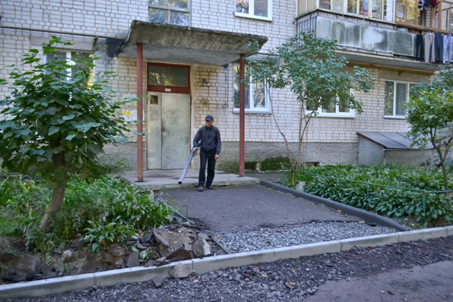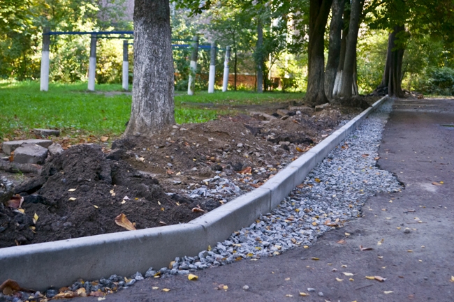В нескольких местах стоят старые бордюры. Андроник указывает на то, что они еще в хорошем состоянии и их менять не стоит. Тем более что это стоит денег — один дорожный бордюр в закупке, например, стоит около 130 гривен. Кстати старые бордюры, по его словам, забирает ЖЕК.