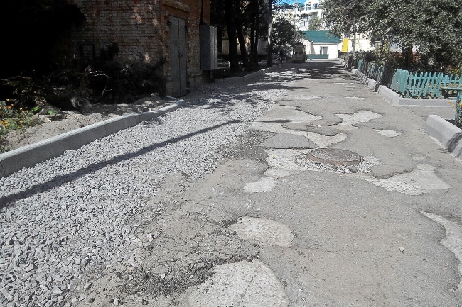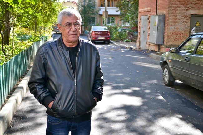 Кроме Рокоссовского, предприятие Андроника Мкртчяна делало ремонт таких же внутриквартальных дорог на улице Толстого. Там площадь работ была меньше — около 2600 квадратных метров. Он предлагает проехать туда и посмотреть, что мы и делаем. Ремонт здесь и вправду сделан неплохо. Но молодая женщина, которая работает здесь дворниоком, сразу указывает на недостатки — не закончены работы по сливам и в одном месте асфальт не прилегает до бордюра. По словам Андроника, отливы от домов — это участок работ ЖЕКа, а что касается щели между асфальтом и бордюром — это, скорее всего, каток слишком близко подошел к бордюру, но ничего страшного там нет, под верхним еще один слой асфальта.