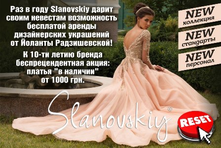 ИНТЕРЕСНО В этом году свадебный бренд Slanovskiy отметил 10 лет совместной работы в Украине. Отпраздновать годовщину компании Slanovskiy предлагает вместе. Специально для невест Чернигова мы проводим беспрецедентную акцию: свадебные платья "в наличии" от 1000 грн! Компания Slanovskiy благодарна тем, кто сделал нас частью своего праздника и раз в году дарит своим невестам возможность бесплатной аренды дизайнерских украшений от Йоланты Радзишевской!