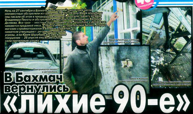Ночь на 27 сентября в Бахмаче была горячей: около трех часов неизвестные обстреляли из гранатометаВ РПГ-26 дом Юрия Шурубуры (мы писали об этом в предыдущем номере), бросил гранату во двор Владимира Пихоты и обстреляли из пистолета внедорожник Валерия Деляева. Все трое — местные предприниматели. Шурубура и Деляев занимаются продажей мяса, а Пихота имеет строительный бизнес, открыл магазин стройматериалов в Бахмаче. Предприниматели утверждают: регулярно получали угрозы, а на Юрия Шурубуру это уже второе покушение — 28 апреля ему во двор бросили тротиловую шашку.