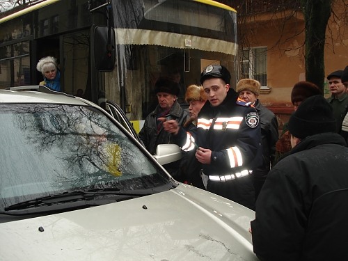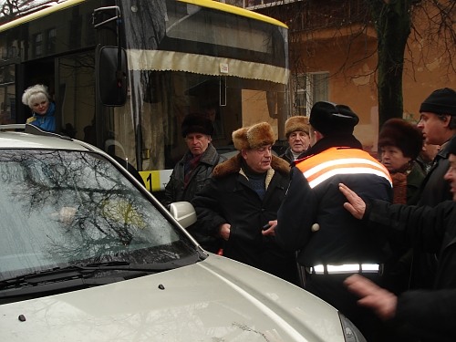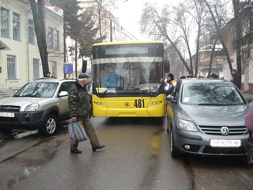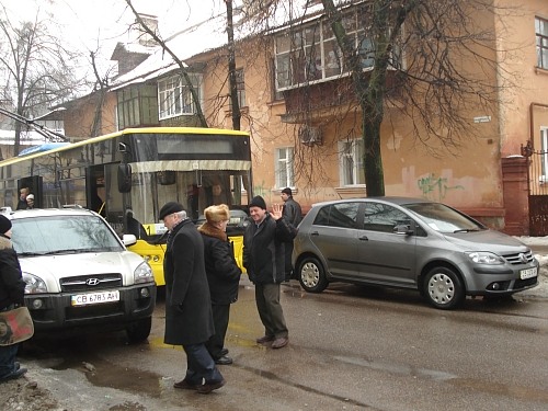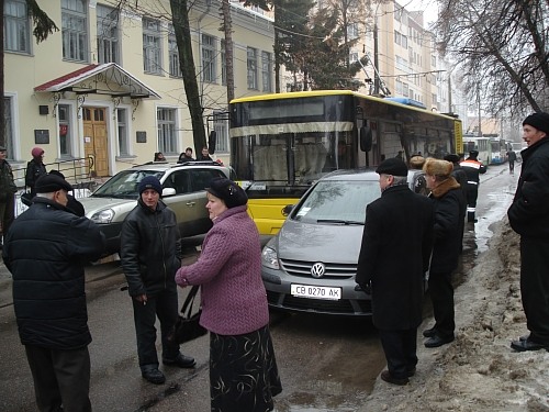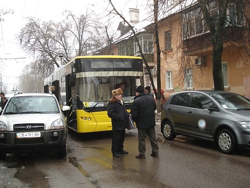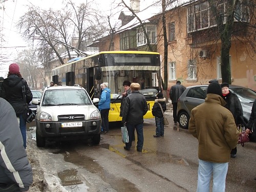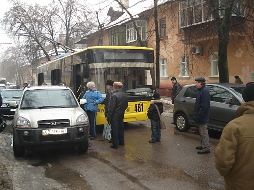 Создали эту пробку два автомобиля, припарковавшиеся на одном уровне слева и справа от края проезжей части рядом с библиотекой им. Коцюбинского. Один из водителей пытался проехать по той части дороги, которую они оставили для проезда, но рисковать троллейбусом не стал. Некоторые пассажиры, быстро оценив обстановку, направились к автобусам, другие остались ждать начала движения. Вокруг автомобилей тут же собралась толпа, но действий никто не предпринимал, ограничившись восклицаниями: «Надо позвонить!», «Бардак в городе!» и так далее. Более всех шумел хорошо выпивший гражданин. Проходивший мимо милиционер остановился, позвонил в ГАИ и стал ожидать вместе со всеми.