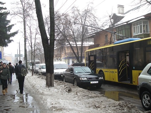 В понедельник, 26 января, в 15.00, пассажирам, вошедшим в троллейбусы на остановке «Кирпоноса», пришлось ждать около 40 минут. Троллейбусы (на остановке их скопилось 8) не могли сдвинуться с места.