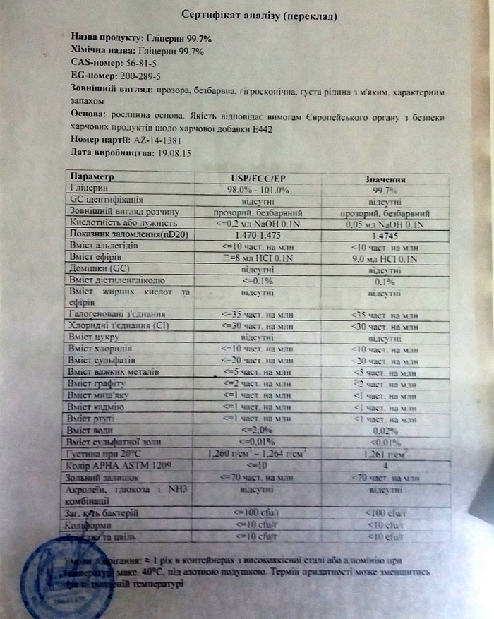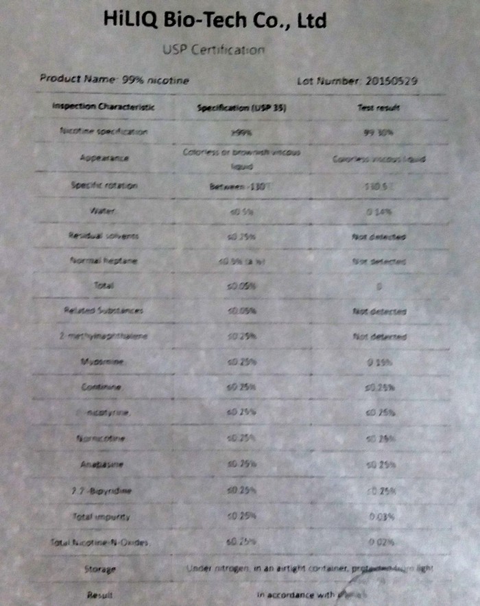 - Жидкости есть с разным вкусом и содержанием никотина, например, повторяющие вкус сигарет Parliament, и безникотиновые, с самыми разнообразными вкусами: вишни, мяты, колы, кофе, шоколада и др, которую в свою очередь имеют различный уровень содержания в них никотина. Но в любом случае в состав жидкости входят: вода, овощной глицерин, пропиленгликоль и ароматизаторы. Все компоненты абсолютно безвредны. Ароматизаторы, например, как известно, добавляют в пищевые продукты, используют в косметической промышленности. Химический анализ мы не проводили, но у нас есть сертификаты качества на все вещества, в том числе, и на никотин. Поставщиками никотина являются США и Китай. В данном случае, этот сертификат Shanghai Hiliq Bio -Tech CO, Ltd на никотин из Китая.