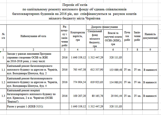 На заседании исполкома Черниговского городского совета 15 сентября этого года было принято решения о выделении финансирования в рамках Программы содействия созданию ОСМД и поддержки домов ОСМД и ЖСК на 2016-2018 годы для трех, скажем так, далеко не социальных домов, срок эксплуатации которых не превышал 10 лет. Поскольку Гражданский кодекс Украины предусматривает гарантийный срок на объекты капитального строительства не менее 10 лет, можно сделать вывод, что при подготовке Программы недоработал юридический отдел горсовета. Так как документация из трех домов ОСМД была подана в соответствии с Программой и в полном объеме, исполком не смог отказать кандидатам.