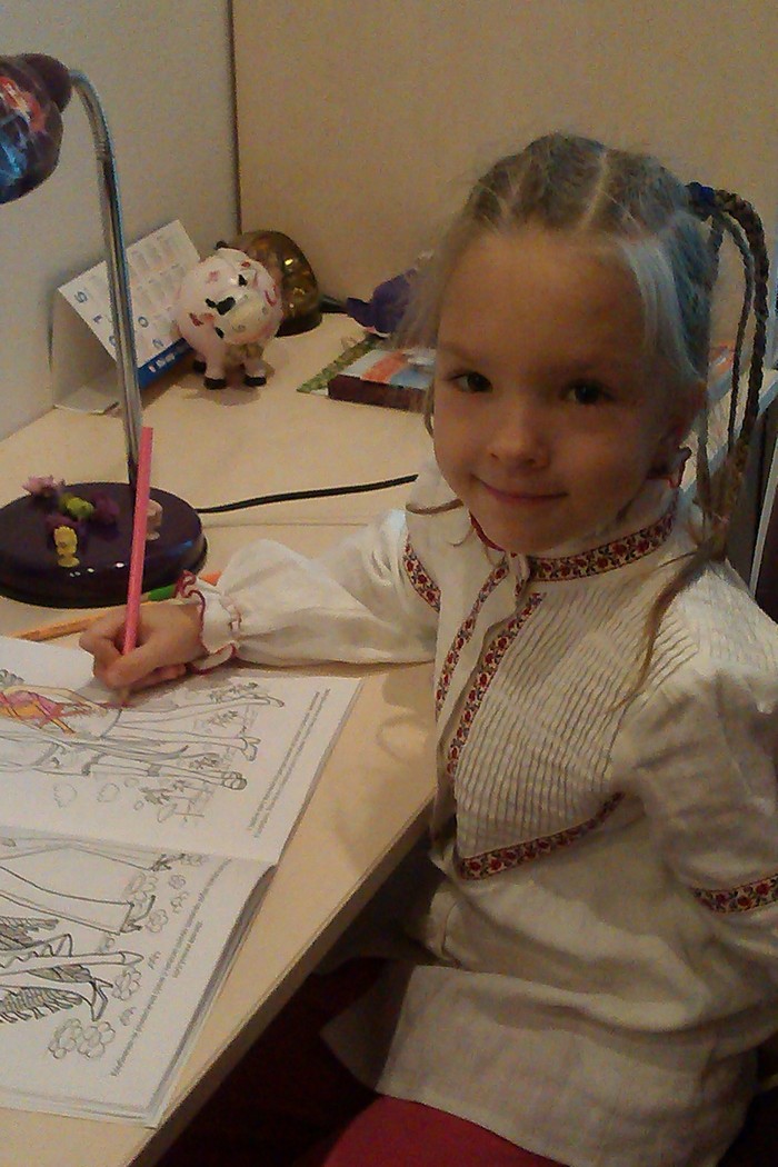 С Софийкой мы пообщались, когда она оформляла поздравительную открытку ко дню рождения своей бабушки. У нее сейчас первые школьные каникулы. Девочка с удовольствием поделилась, что очень любит танцевать (занимается в коллективе «Ярмарка») и рисовать, ей нравится посещать школу, где дружит с одноклассницей Евой, и читать «Букварь». Еще она показала свои тетрадки, там по письму и математики часто стоит подпись учительницы «Молодец!». Она рассказала, что учительница пока не ставит оценки, а за каждую похвалу разрешает рисовать цветочек на последней страничке дневника. София рада, что у нее получилось за четверть 67 цветочков. Девочка мечтает вырасти и стать доктором, чтобы лечить детей. Ну, а пока она лечит своих кукол.