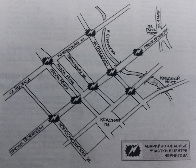 Есть в городе и особо аварийные участки, несколько отдаленные от центра. Таковыми, по статистике ГАИ, являются: перекресток улицы Рокоссовского - проспекта Победы (20 ДТП, в которых 1 человек погиб, 13 – травмированы), перекресток улицы Боевой – проспекта Мира (19 ДТП, в которых 1 человек погиб, 4 – травмированы) и участок улицы 1 Мая (от ул. Седневская до ул. ген. Белова). На этом отрезке за три года, зафиксировано 28 ДТП, в которых один человек погиб, 18 получили травмы различной тяжести.