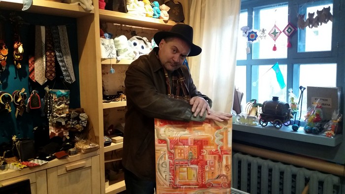В «Зеленой лавке» были и покупатели. Уделив им свое внимание, навстречу мне вышла улыбающаяся девушка. Но начать беседу с ней сразу не удалось, так как в магазинчике находился такой же улыбающийся мужчина, который принес на продажу две своих картины. Разговорившись с ним, я узнала, что его зовут Геннадий Томин, ему 44 года, он разведен, работает охранником, но с некоторых пор почувствовал некую тягу к творчеству. Художником себя не считает, скорее, копировальщиком-любителем, а еще музыкантом и весельчаком по жизни. Записал музыкальные альбомы с С. Галамагой, принимал участие в составе: Томин Геннадий, Коржова Юлиана и их гномы:-) в стиле клоун-поп-рок в проекте «Слухай ЧЕ». Любит и помогает бездомным животным. Сегодня принес картины в «Зеленую лавку» первый раз, до этого получал удовольствие, даря свои картины тем, кому они нравились. Геннадий рассыпался в похвалах в адрес «Зеленой лавки», и рассказал, что был безумно рад, что Зелена сцена, закрывшись, нашла свое продолжение в этом уютном атмосферном местечке.