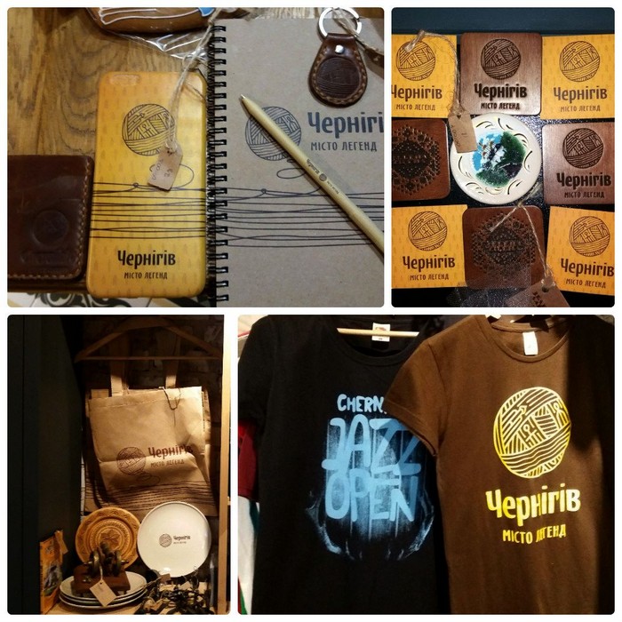 - изделия с черниговской символикой (футболки с дизайнерским принтом, «Чернігів – місто легенд», «Chernihiv jazz open», блокноты, визитницы и брелки из натуральной кожи, ручка из эко-картона, деревянные магнитики, тарелки, чашки, книги о Чернигове и области;