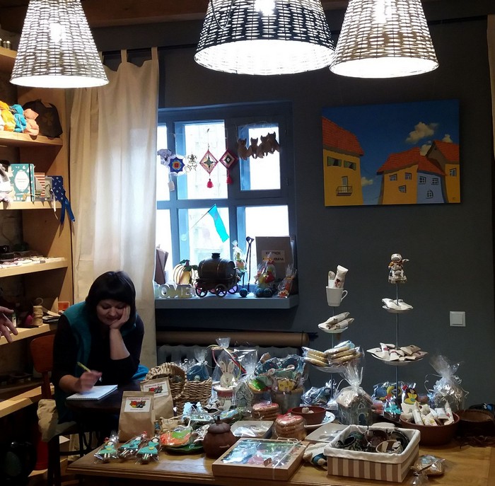 В центре магазина находится целый стол со сладостями. В основном, это медовые и имбирные пряники от двух черниговских мастеров в форме домика, сердечек, человечков и др., пряничные наборы и фруктово-ягодная пастила. Небольшой пряник в среднем стоит от 12 до 20 гривен. Довольно большой пряничный домик стоит 150 грн.