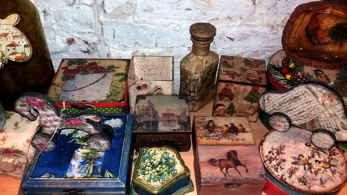 - стеклянные и деревянные изделия в технике декупаж (шкатулки, игрушки, бутылки, коробки, доски);