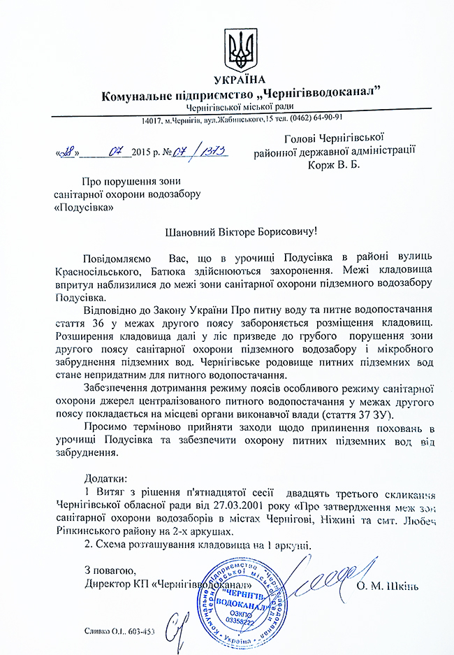 Водоснабжение Чернигова обеспечивают пять водозаборов. В соответствии с ЗУ «Про правовий режим зон санітарної охорони водних об'єктів» областной совет установил охранные зоны для всех существующих водных объектов. Для каждой из зон определён свой режим, который должен строго соблюдаться, но, тем не менее, в последние годы ситуация вышла из-под контроля. За последние 15 лет кладбище в зоне водозабора «Подусовка» разрослось, и угрожает экологической безопасности Чернигова. Уже несколько лет подряд КП «Черниговводоканал» «бомбит» письмами все инстанции в надежде обеспечить правовую защиту второго по величине водозабора города. Но, пока – безрезультатно.