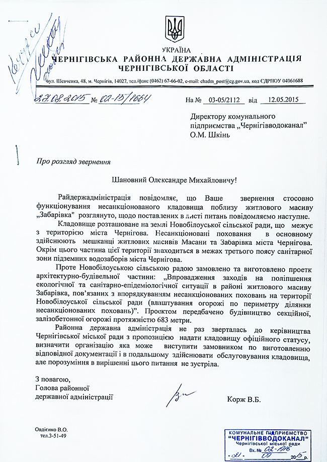 На все письма и обращения КП «Черниговводоканал» отсутствует должная реакция. Национальная полиция рекомендует Водоканалу решать проблемы с местным самоуправлением. Новобелоусский сельсовет заявляет, что у них – свое кладбище и к Забаровскому они отношения фактически не имеют, а содержать два кладбища просто не в состоянии. Черниговская районная госадминистрация считает достаточным ответ о том, что Новобелоусский сельсовет заказал и выполнил проект строительства забора вокруг кладбища. Но, заказать проект – это не означает построить сам забор длинной в 683 метра. Кроме того, необходимо произвести вынос границ земельного участка в натуру, что тоже стоит денег. Ни на забор, ни на оформление земельного участка у сельского совета нет денег, и вопрос не сдвигается с мертвой точки.