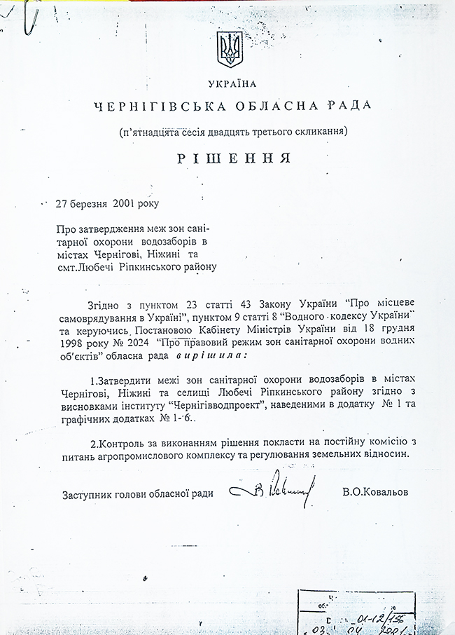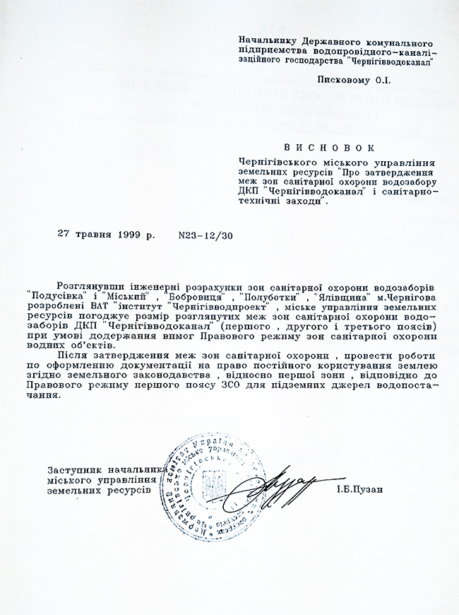 Правовой режим водозабора «Подусовка» был установлен решением пятнадцатой сессии третьего созыва 27 марта 2001 года. На сегодняшний день из этого водозабора снабжается водой фактически треть города – Масаны, Подусовка, Забаровка и часть Чернигова, вплоть до проспекта Мира. Водозабор дает до 20 тыс куб м воды в сутки. И обеспечить замену этому водозабору нет ни технической, ни финансовой возможности. Тем более что стоимость имеющихся там скважин и оборудования – десятки, а то и сотни миллионов гривен!