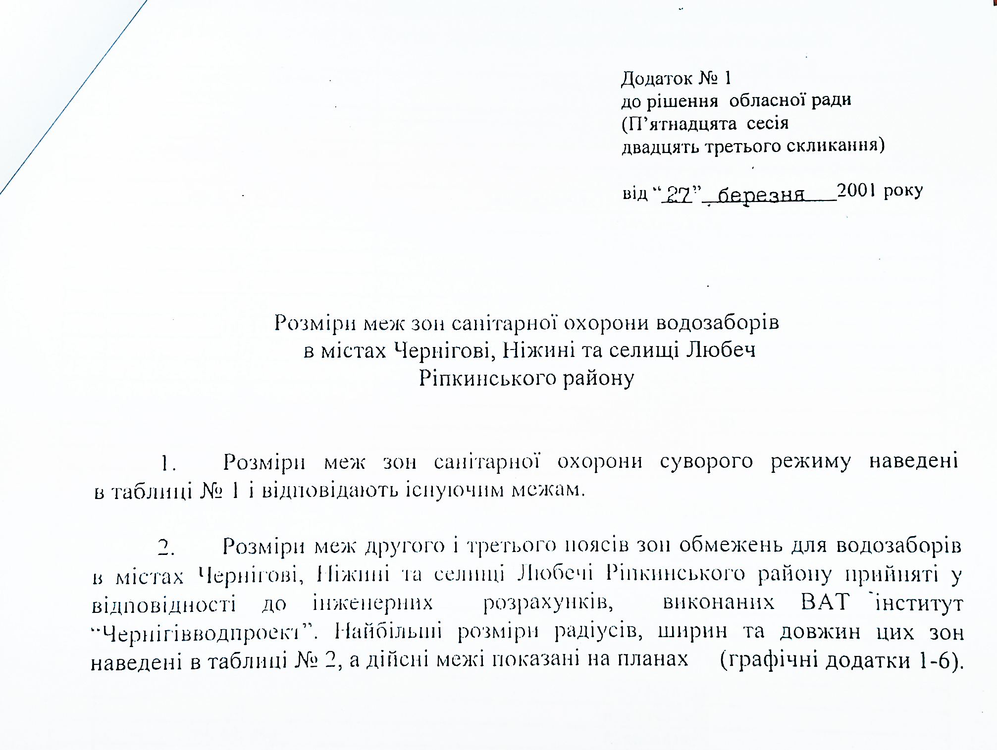 Согласно закону «Про питну воду та питне водопостачання» вопросами определения охранных зон водозабора занимается Черниговский областной совет, а контроль осуществляет Черниговская ОГА. Скорее всего, и Новобелоусскому сельскому совету и КП «Черниговводоканал» следует обращаться именно в эти органы власти.