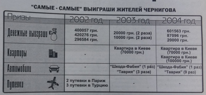 Руководитель черниговского представительства М.С.Л. Андрей Пирожок поведал газетчикам о том, какие самые весомые выигрыши в лотерею были у жителей Черниговской области. Так, выяснилось, что жительница Бахмача выиграла квартиру в столице за 100 тысяч гривен, 20 тысяч летом 2004-го выиграл житель Гончаровского, который купил свой счастливый билетик в подземке областного центра. Еще один человек выиграл автомобиль «Шкода-Фабия» за 66 тысяч гривен. Ниже табличка со всеми крупными выигрышами за 2002-2004 годы.