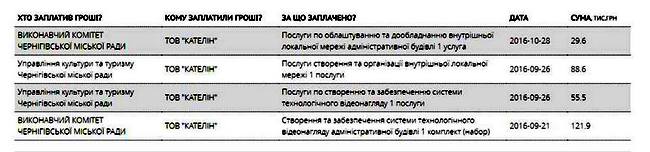 За результатами переговорної процедури Чернігівська міська рада уклала договори із чернігівською фірмою «Кателін» на встановлення камер спостереження у середні та зовні будівлі міської ради та прокладення відповідної мережі. Загальний кошторис таких робіт складає більше 295 тисяч гривень.