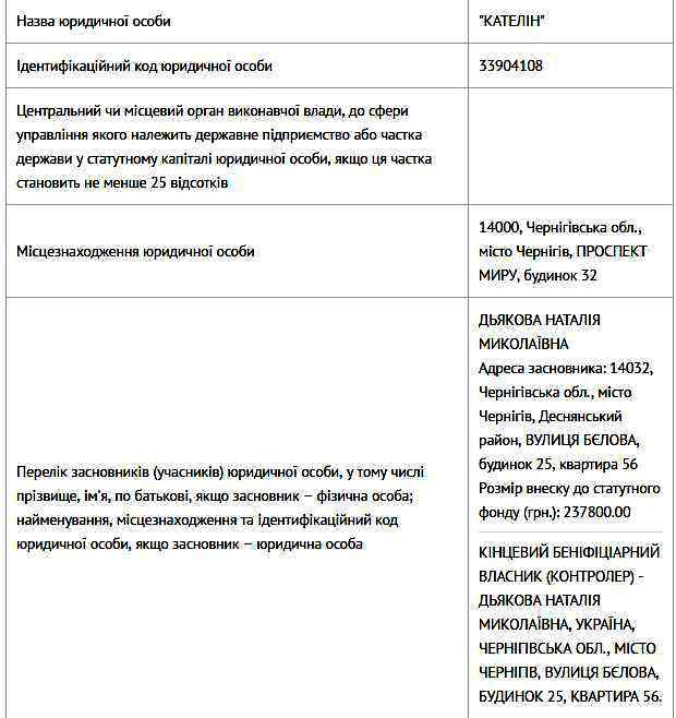 А засновником ТОВ "Кателін" - є Д'якова Наталія Миколаївна, яка також входить до складу засновників багатьох підконтрольних Атрошенком підприємств, таких, як "Айліс", "Північна зернова компанія", "І.Т.Т", "Охоронне агенство "Каскад ХХІ" тощо.