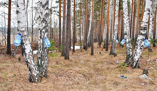 В эти весенние дни в разгаре и сбор березового сока. Почти под каждой мало-мальски окрепшей березкой стоят большие и маленькие банки, "балсанки", бутылки, в которые капля за каплей падает прозрачная, чуть сладковатая жидкость - березовый сок. "...То плачут, березы" - пелось в некогда популярной песне. И есть от чего заплакать. В нашем государстве разрешен исключительно промышленный сбор березового сока на специально выделенных для этого лесных участках. Причем разрешение на его проведение могут выдать только лесохозяйственные предприятия при наличии специальных лесных билетов. Сок берут лишь у тех деревьев, которым осталось 10 лет до порубки. Для березы этот возраст начинается с 50-ти лет. В населенных пунктах, согласно "Правилам содержания зеленых насаждений городов Украины", заготовка древесных соков запрещена!