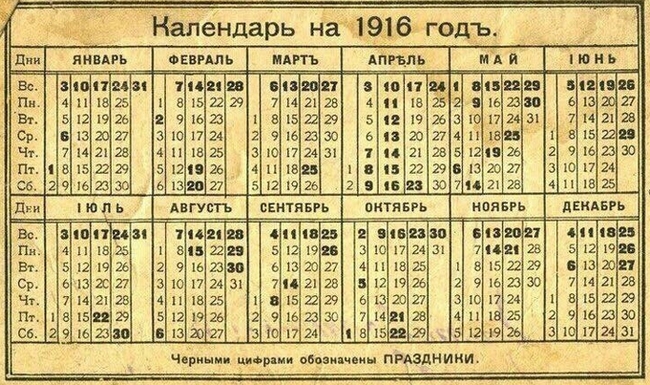 Календарь високосных годов «клонируется» через каждые 28 лет. Нынешний — самая свежая копия 1988-го (в том смысле, что в разные годы одним и тем же числам месяца соответствуют те же самые дни недели). Такой же был и сто лет назад — в 1916-м.