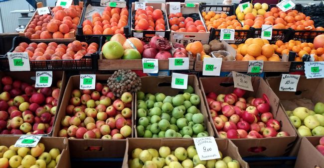 Как и на других рынках города, в этот период времени большой выбор разных сортов яблок, хурмы, граната и мандаринов. Есть в продаже несколько сортов винограда и тропические помело и свити. Яблоки привезены к нам из Винницы, Черкасс и Черновцов. Цены пока остаются на прежнем уровне.